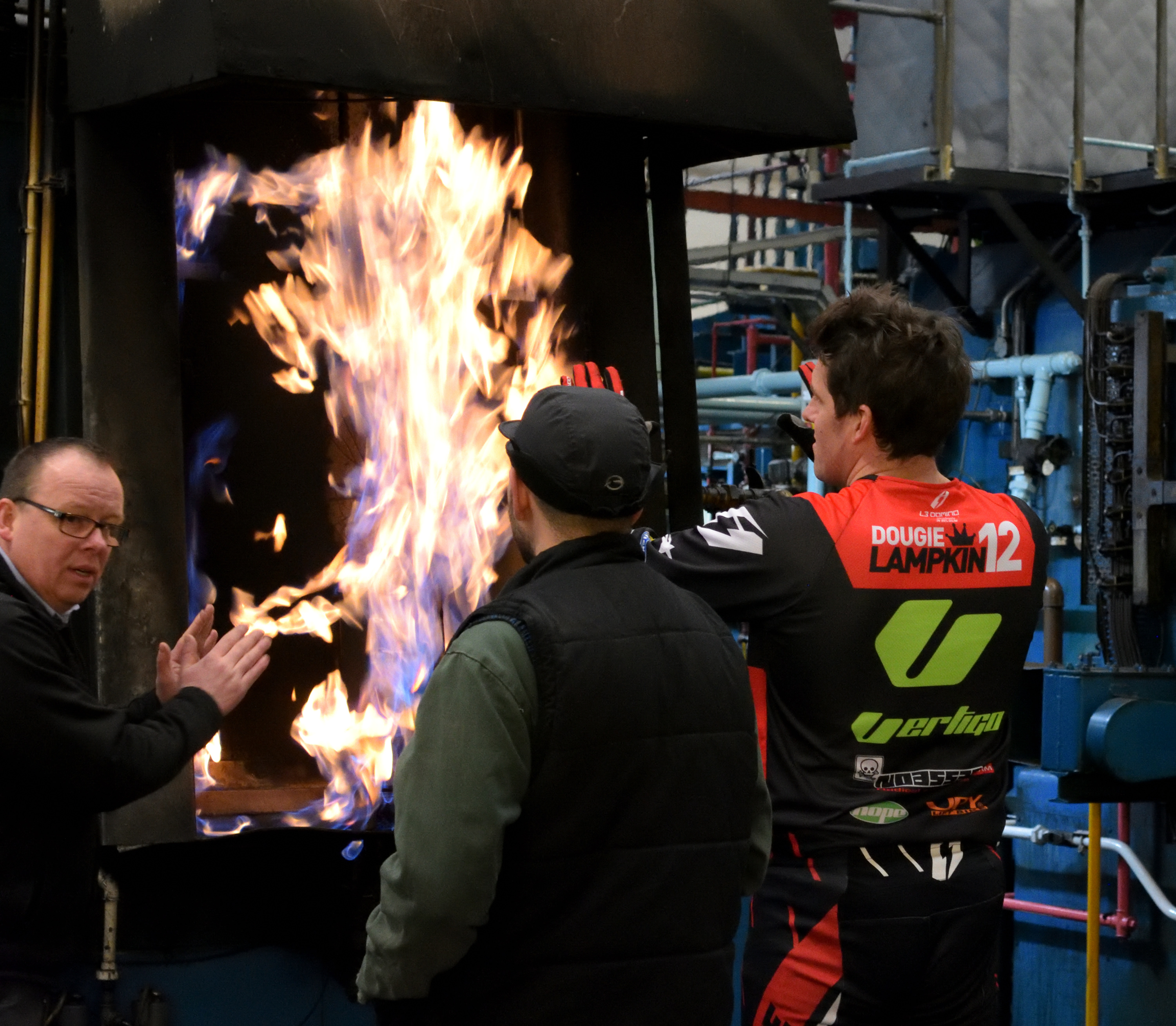 1a) 12 times Trials World Champion, Dougie Lampkin, rides past flaming furnaces at Wallwork Heat Treatment