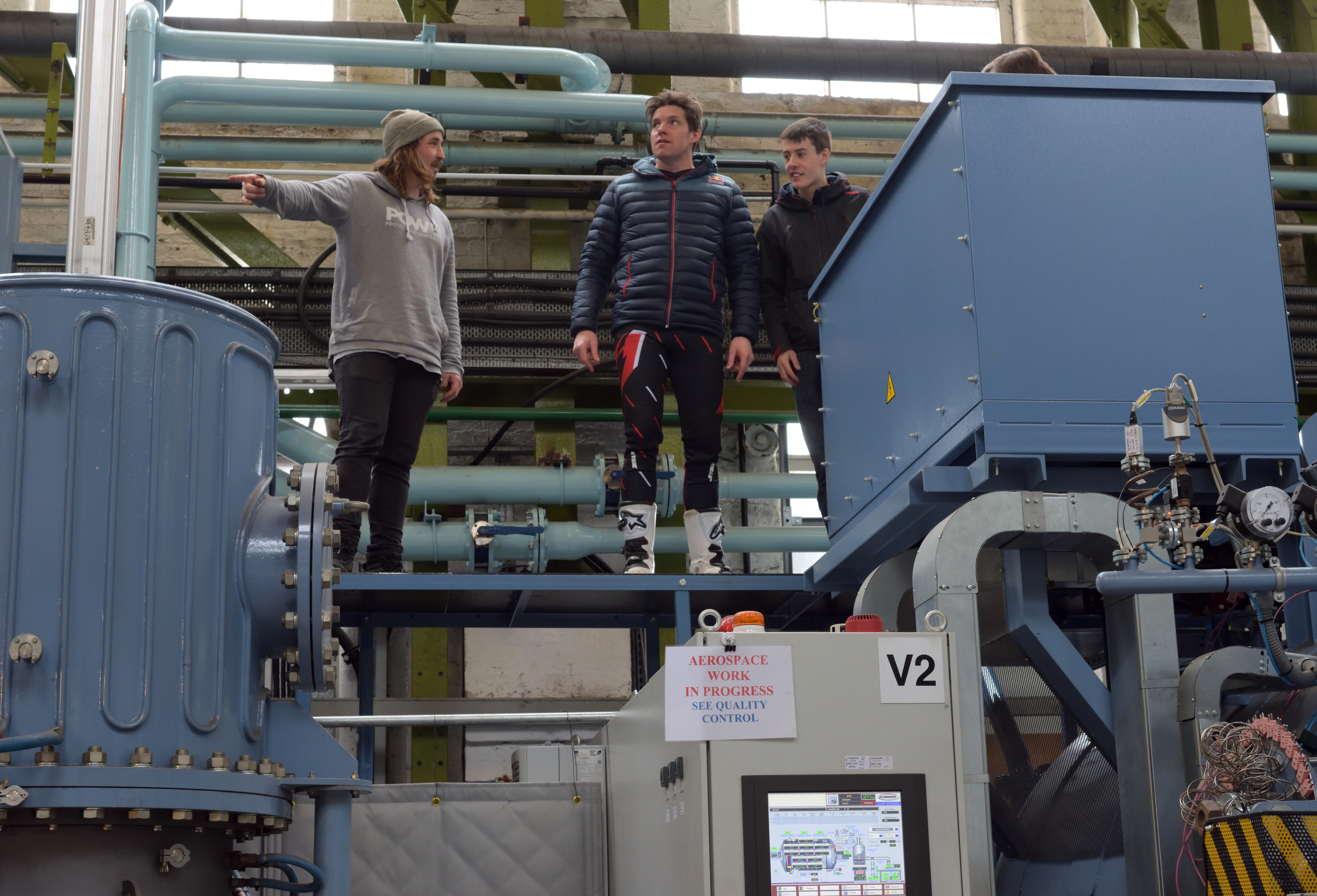 4) Dougie Lampkin with members of the video crew lining up jumping off a vacuum furnace